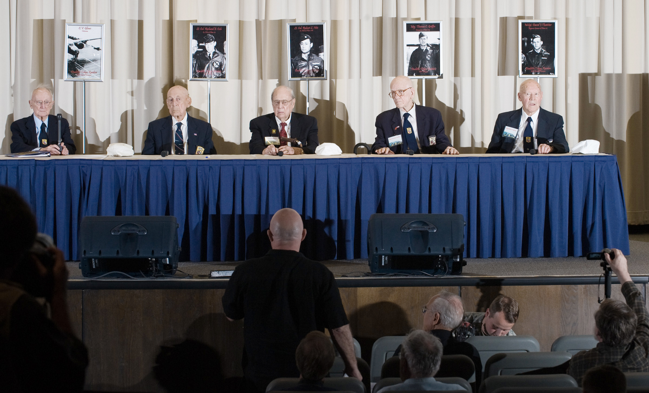 C.V. Glines (far left), Doolittle Raiders historian and author, moderates a question and answer session between news media and Doolittle Raiders April 16, 2010, at the National Museum of the U.S. Air Force at Wright-Patterson Air Force Base, Ohio. Answering questions were (left to right) Lt. Col. Richard E. Cole, Lt. Col. Robert L. Hite, Maj. Thomas Griffin and Master Sgt. David J. Thatcher. (U.S. Air Force photo/Lance Cheung)