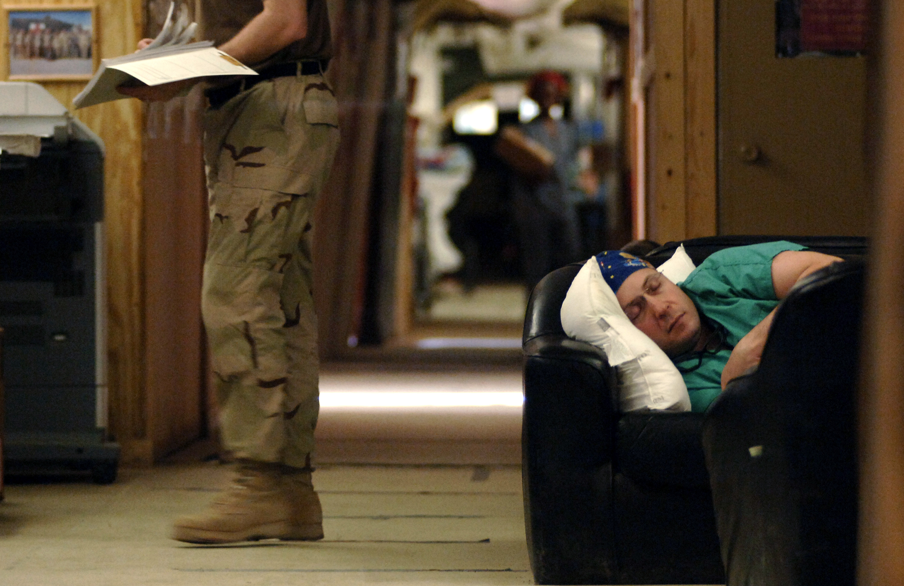Cardio-thoracic surgeon Lt. Col. (Dr.) Jerry Pratt takes advantage of down time Feb. 21 in a room adjacent to the emergency room in the Air Force Theater Hospital at Balad Air Base, Iraq. The hospital that owns a survival rate of 98 percent. (U.S. Air Force photo/Tech. Sgt. Cecilio M. Ricardo Jr.)