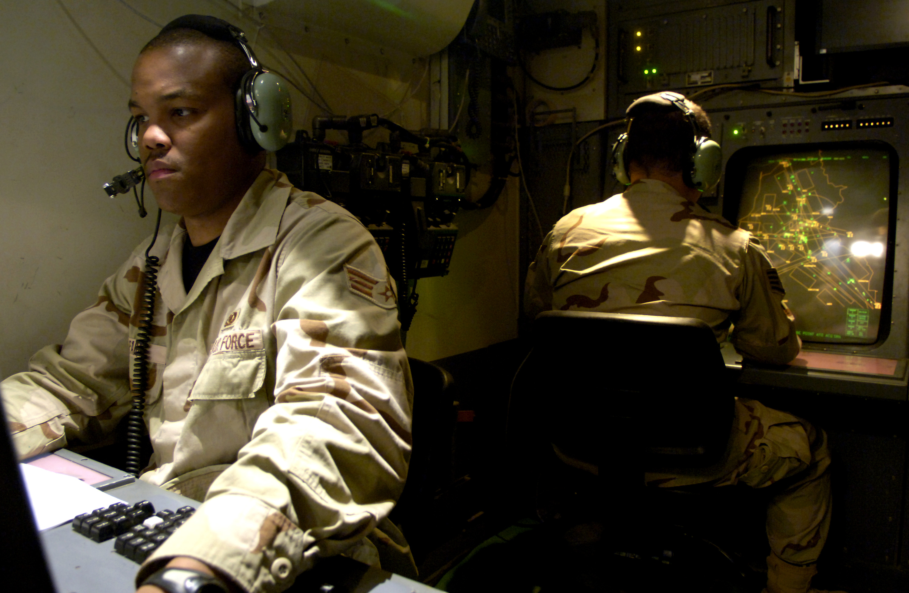 Senior Airman Derrick Farr performs surveillance and identification procedures with aircraft flying in the vicinity of Balad Air Base, Iraq, on May 15, 2006. Controllers here monitor more than 200,000 square miles of air space. The airfield is the busiest single-runway airfield in the Department of Defense. Airman Farr is an air traffic controller with the 332nd Expeditionary Operation Support Squadron and is an Air National Guardsman deployed here from Savannah, Ga. (U.S. Air Force photo/Senior Airman Brian Ferguson)