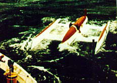 Three men are rescued by the Coast Guard after their sailboat capsized 300 miles from Cape Cod in 1982. A commercial airliner picked up the signal from their Emergency Position Indicating Radio Beacon; USAF Rescue Coordination Center provided COSPAS/SARSAT location data to aid in the rescue. (U.S. Air Force photo)