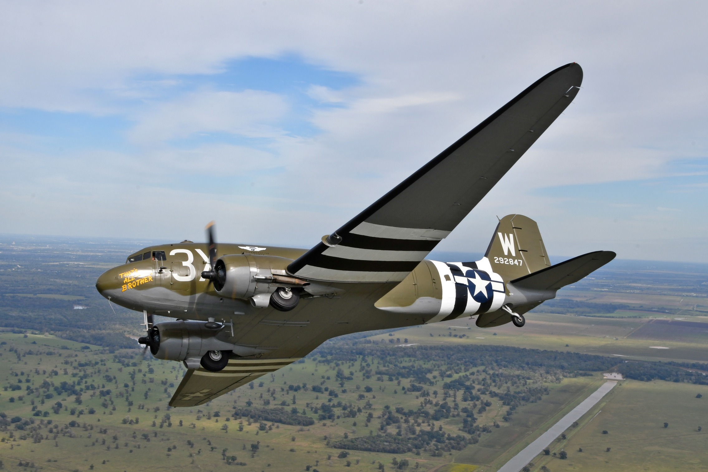 That’s All, Brother, piloted by Lt. Col. John Donalson, was a lead aircraft for the airborne invasion of Normandy on D-Day, June 6, 1944. After D-Day and several other missions, the airplane returned to the United States and was sold on the civilian market in 1945. Over the next several decades, this C-47 changed hands many times and its historical significance was lost. Ultimately, two historians from the U.S. Air Force discovered that this historic aircraft was lying in a boneyard in Wisconsin. The Commemorative Air Force was able to acquire the aircraft and return it to flying status. That’s All, Brother has been restored to its authentic 1944 condition, including its D-Day paint scheme and original interior. The aircraft returned to the skies over Normandy for the commemoration of the 75th Anniversary of D-Day in 2019.