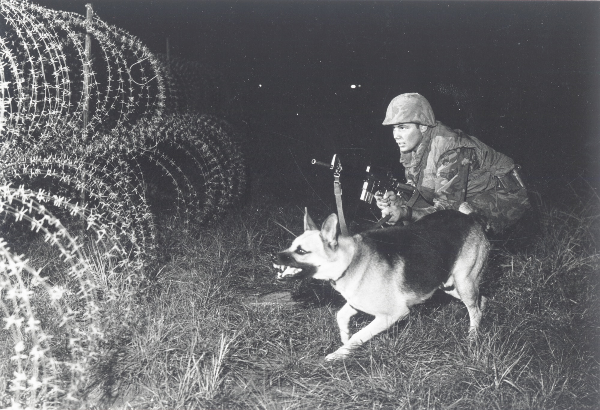 Through the hours of darkness, sentry dogs and their handlers patrolled along the perimeters of U.S. Air Force air bases. The enemy was rarely able to get past the keen senses of the sentry dogs unnoticed, and these sentry dog teams remained by far the most effective means to detect enemy movement at night.